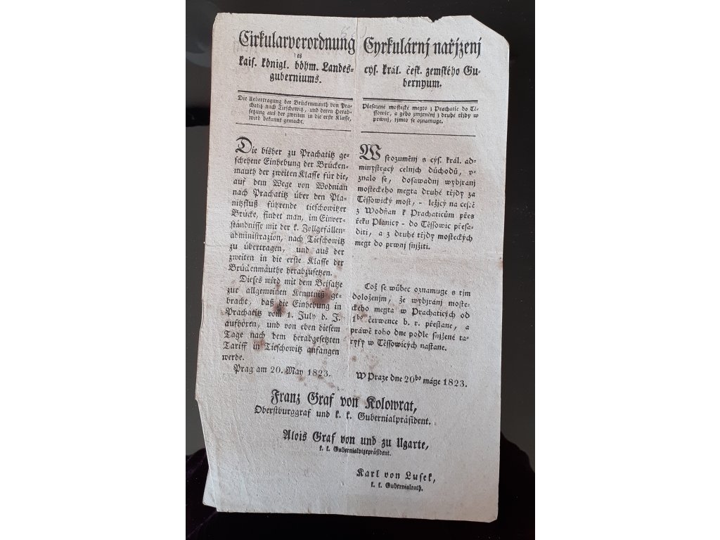 1823.05.20. Cirkulární narízení českého zemského gubernia, kterým přesazené mostecké mejto z Prachatic do Těšovic a jeho zmírnění z druhé třídy v první, se tímto oznamuje.