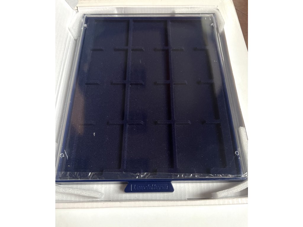 Mincovní box s plastovým krytem má drobnou vadu, ale přesto si zachoval svou funkčnost. Lze ho tak použít pro ukládání mincí. Box je štosovatelný.