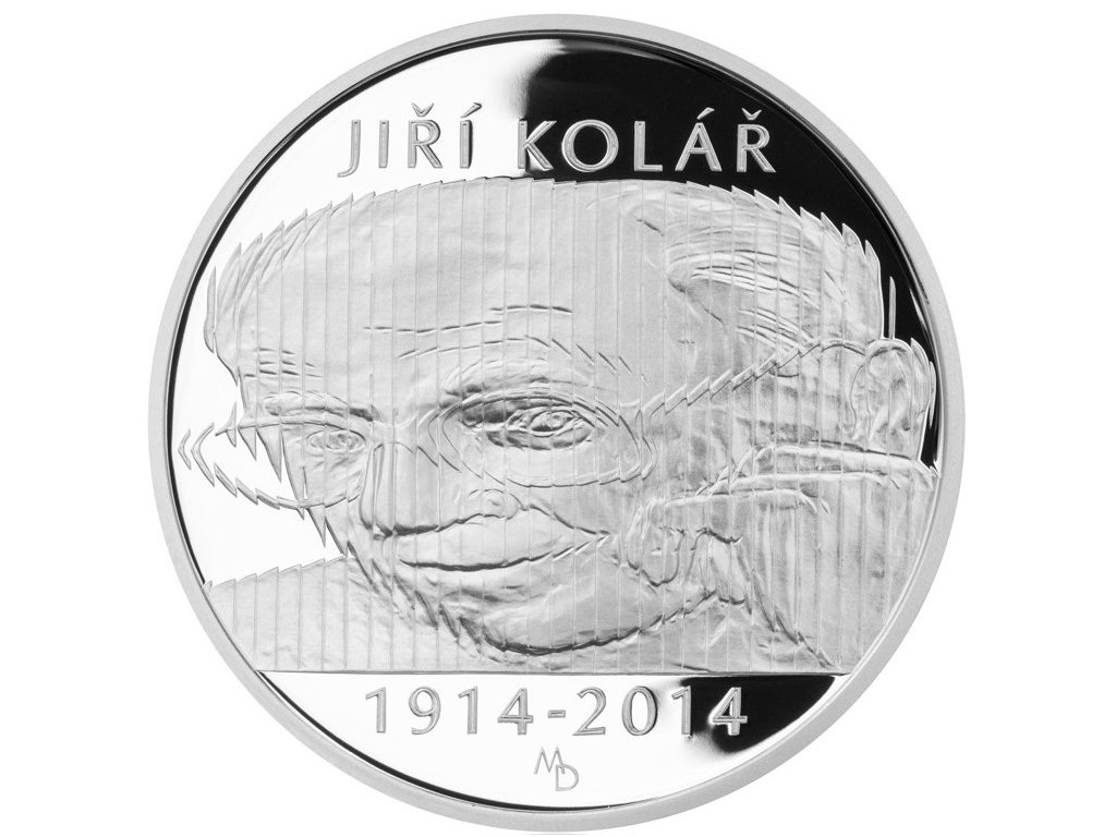Dnem 24. září 2014 vydává Česká národní banka pamětní stříbrnou pětisetkorunu ke 100. výročí narození výtvarníka a básníka Jiřího Koláře. Pětisetkoruna je ražena ze slitiny obsahující 925 dílů stříbra a 75 dílů mědi a vydává se ve dvojím provedení, v běžném a špičkovém (proof), které se liší povrchovou úpravou a provedením hrany. U mincí špičkové kvality je pole mince vysoce leštěné a reliéf je matován, hrana je hladká s vlysem „ČESKÁ NÁRODNÍ BANKA * Ag 0.925 * 25 g *“. Mince běžné kvality mají hranu vroubkovanou. Průměr mince je 40 mm, hmotnost 25 g a síla je 2,85 mm. Stejně jako u každé ražby mincí jsou i u těchto mincí povoleny odchylky v průměru 0,1 mm a v síle 0,15 mm. V hmotnosti je povolena odchylka nahoru 0,26 g a v obsahu stříbra odchylka nahoru 1 %.