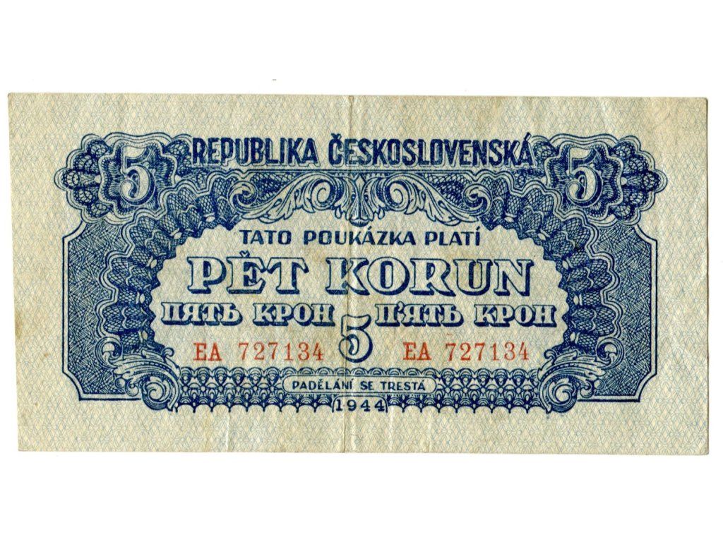 ČESKOSLOVENSKO. 5 korun 1944. Série EA. Nov. 57a.