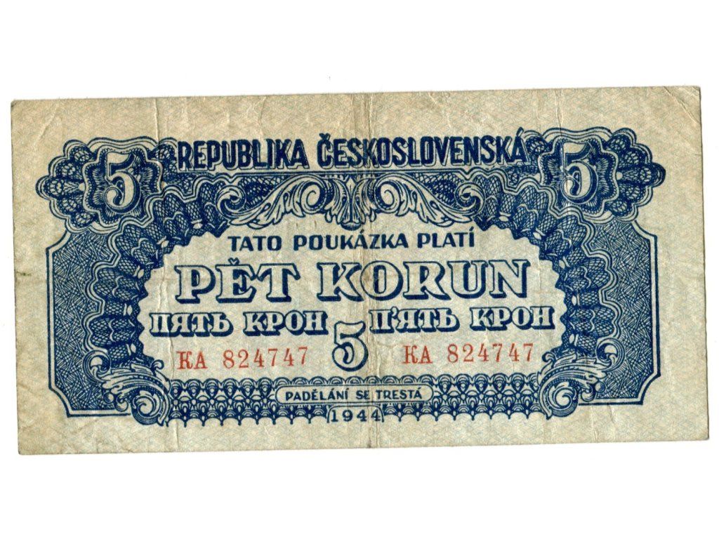 ČESKOSLOVENSKO. 5 korun 1944. Série KA. Hej. 57b.
