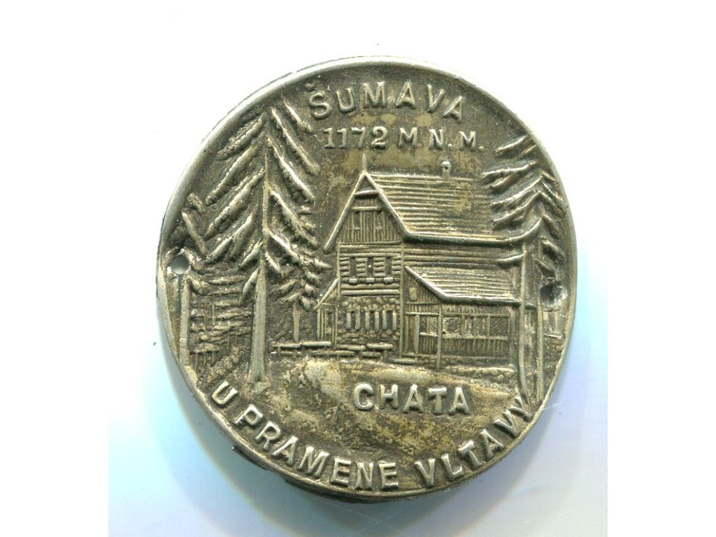 CHATA u pramene Vltavy. Šumava. Štítek na hůl.