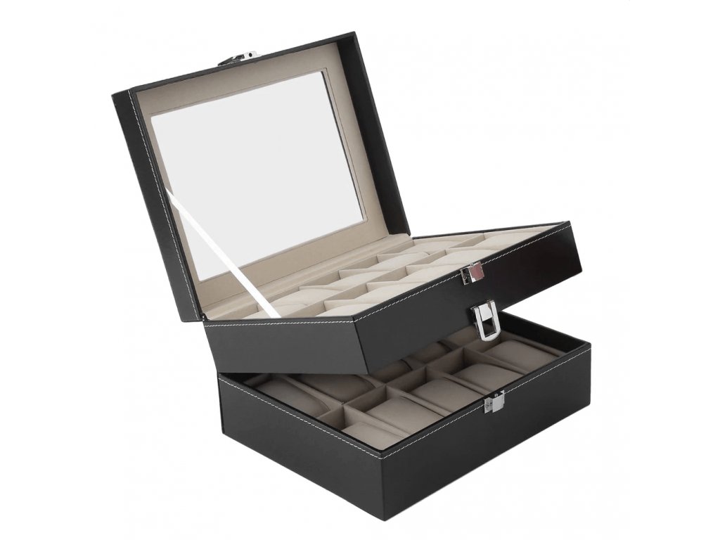 Dvoupatrová kazeta na 20 náramkových hodinek - černá koženka