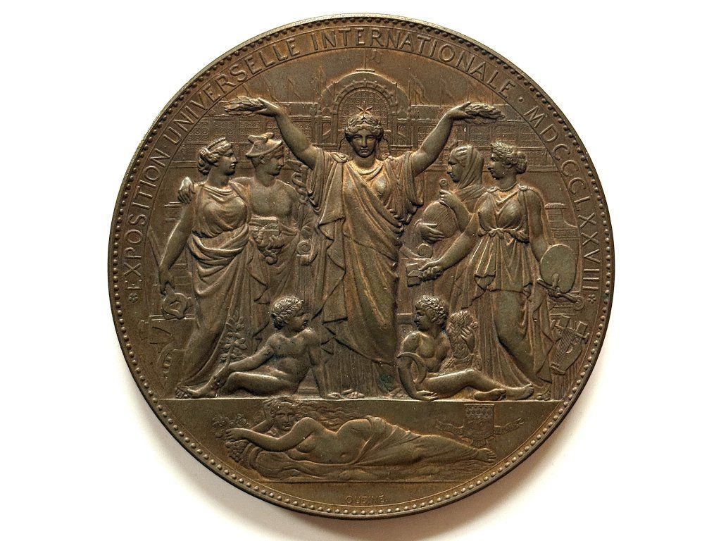 Signováno: OUDINÉ Průměr: 86 mm Obverse legend : *EXPOSITION UNIVERSELLE INTERNATIONALE. MDCCCLXXVIII*. Obverse description: Figures allégoriques devant le palais de l’exposition, une femme à demi-vêtue allongée à l’exergue. Signé : OUDINE.. REVERSE Reverse legend: .REPUBLIQUE* FRANCAISE. - PLANS. DES. BATIMENTS. DE L’EXPOSITION. UNIVERSELLE. DU. CHAMP. DE. MARS. ET. DU. TROCADERO // L’AN - MDCCCLXXVIII - LE HUITIEME DE LA / REPUBLIQUE. FRANC - LE MARECHAL / DE. MAC-MAHON - DUC. DE. MAGENTA / ETANT - PRESIDENT / TEISSERENC - DE BORT / MINISTRE. DU COMMERCE - ET DE L’AGRICULTURE / JN BAPTTE - KRANTZ / SENATEUR - COMMISSAIRE GL / EST INAUGURE - L’EXPOSITION / UNIVER - - -SELLE. Reverse description: Plan du Champ de Mars tenu par deux angelots sous une couronne de lauriers. Signé : OUDINE.