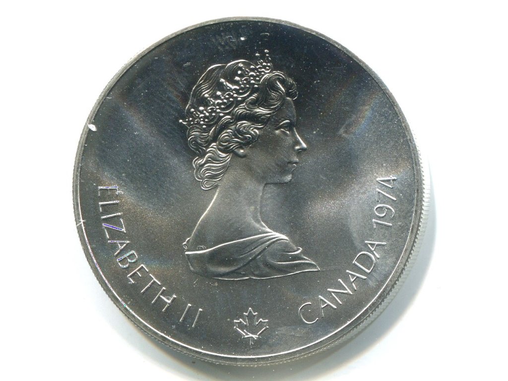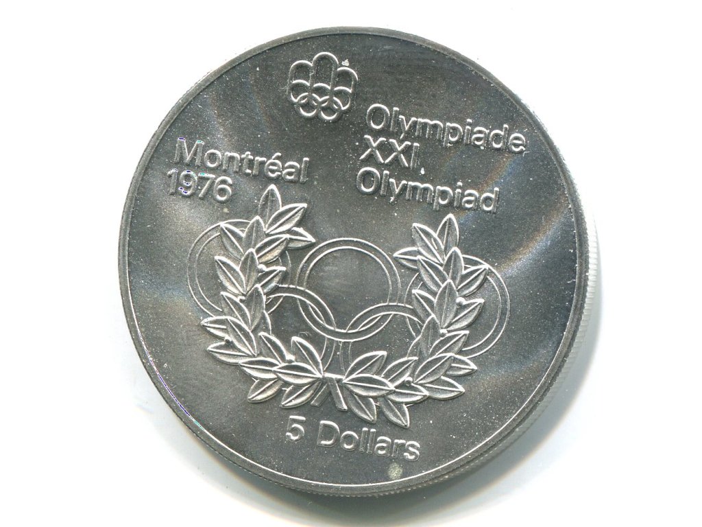 KANADA. 5 dollars 1974. Olympijské hry Montreal 1976. Olympijské kruhy. Ag.