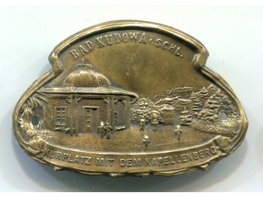 KUDOWA ZDRÓJ / Bad Kudova i. Schl. Kurplatz mit dem Kapellenberg. Štítek na hůl.