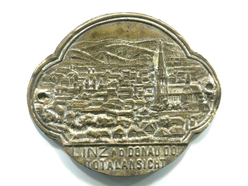 LINZ a. d. Donau. Totalansich. Rakousko. Štítek na hůl.