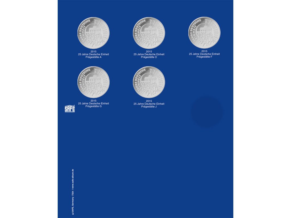 Speciální sběratelský list SAFE 7334 určený pro uchovávání a prezentaci pamětních 25€ mincí vydaných k příležitosti Německé jednoty (2015). Tento prémiový list je navržen pro dokonalé uložení vašich cenných mincí v rámci systému TopSet mincovních alb, které oceňují sběratelé po celé Evropě.