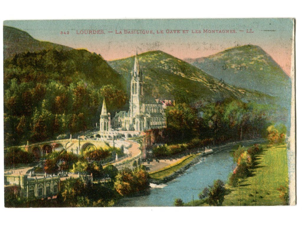 LOURDES. LA BASILIQUE, LE GAVE ET LES MONTAGNES.