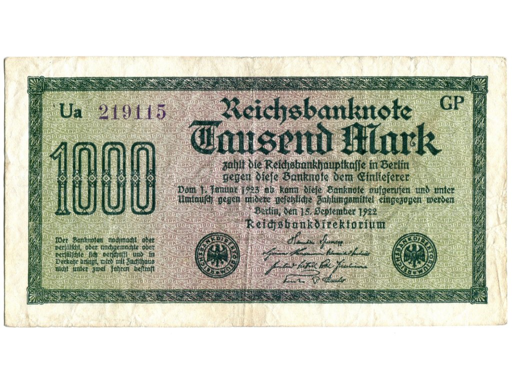 NĚMECKO. 1.000 Mark. Ro. 75k. 15. 9.1922. Firma GP, série Ua. VZ: křížky.