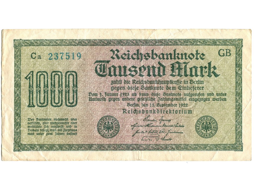 NĚMECKO. 1.000 Mark. Ro. 75m. 15. 9.1922. Firma GB, série Ca. VZ: mříže s 8.