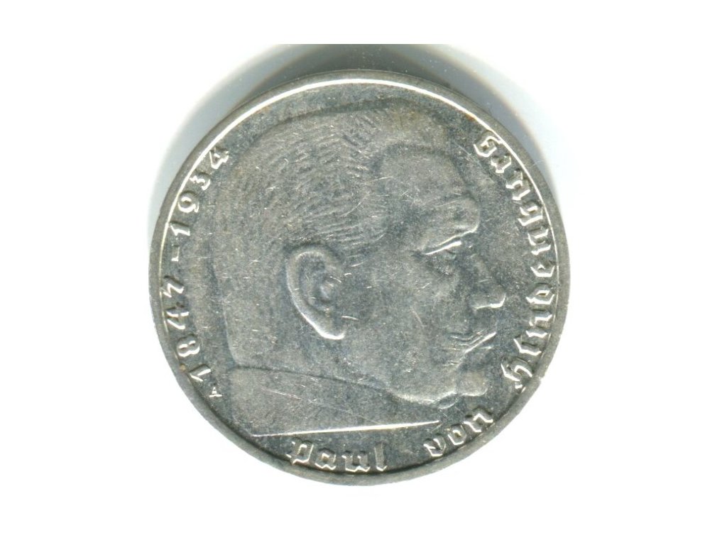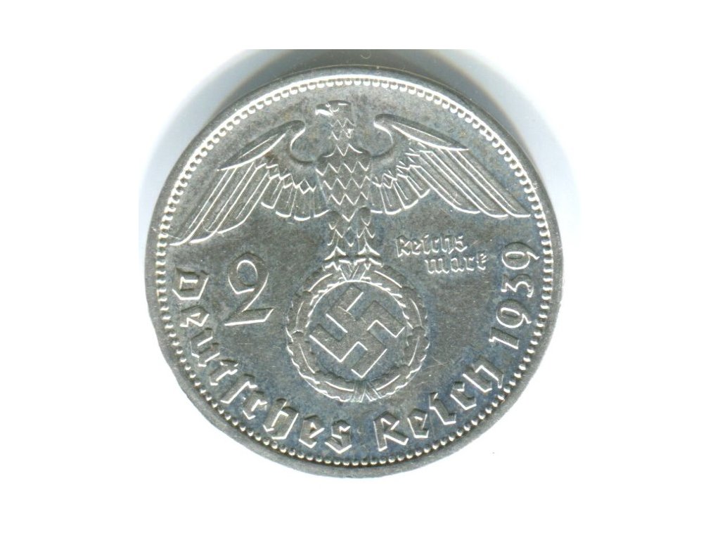 NĚMECKO. 2 Mark 1939/A. Hindenburg, hákový kříž. Ag.