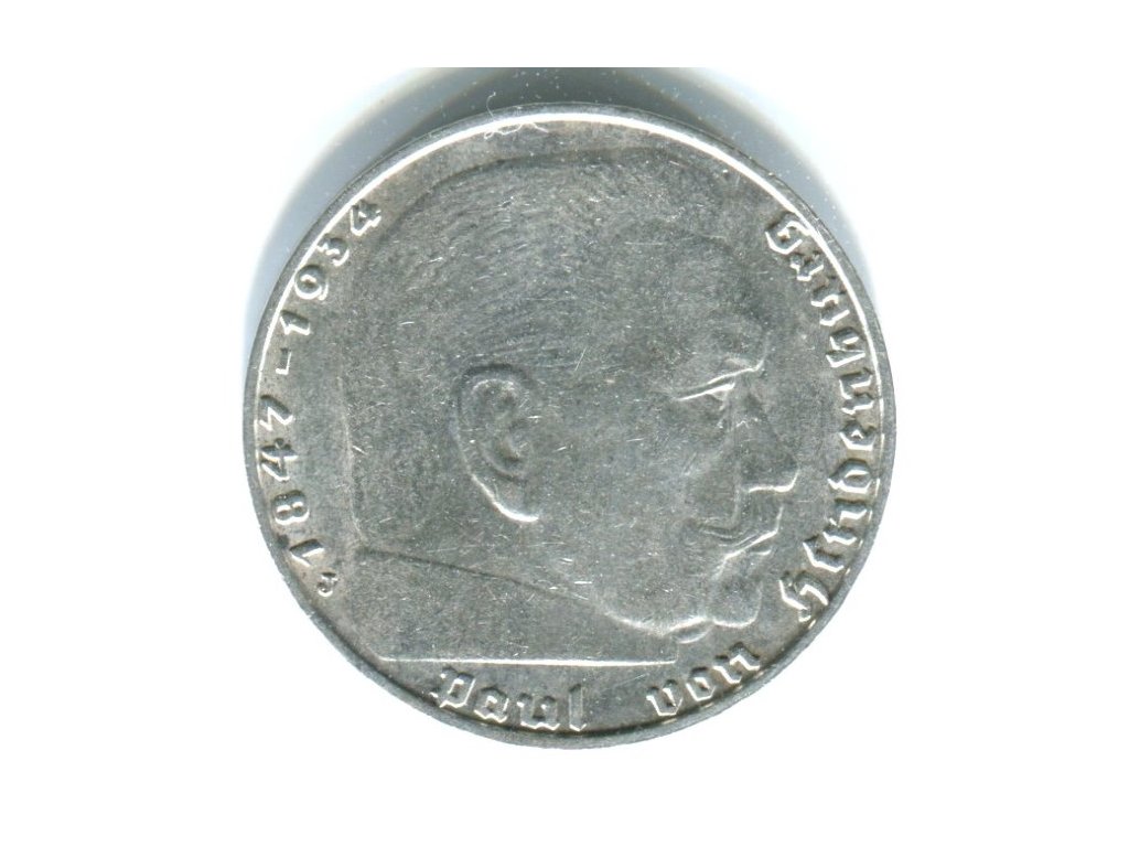 NĚMECKO. 2 Mark 1939/J. Hindenburg, hákový kříž. Ag.