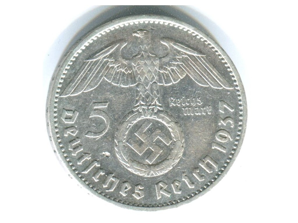 NĚMECKO. 5 Mark 1937/A. Hindenburg, hákový kříž. Ag.