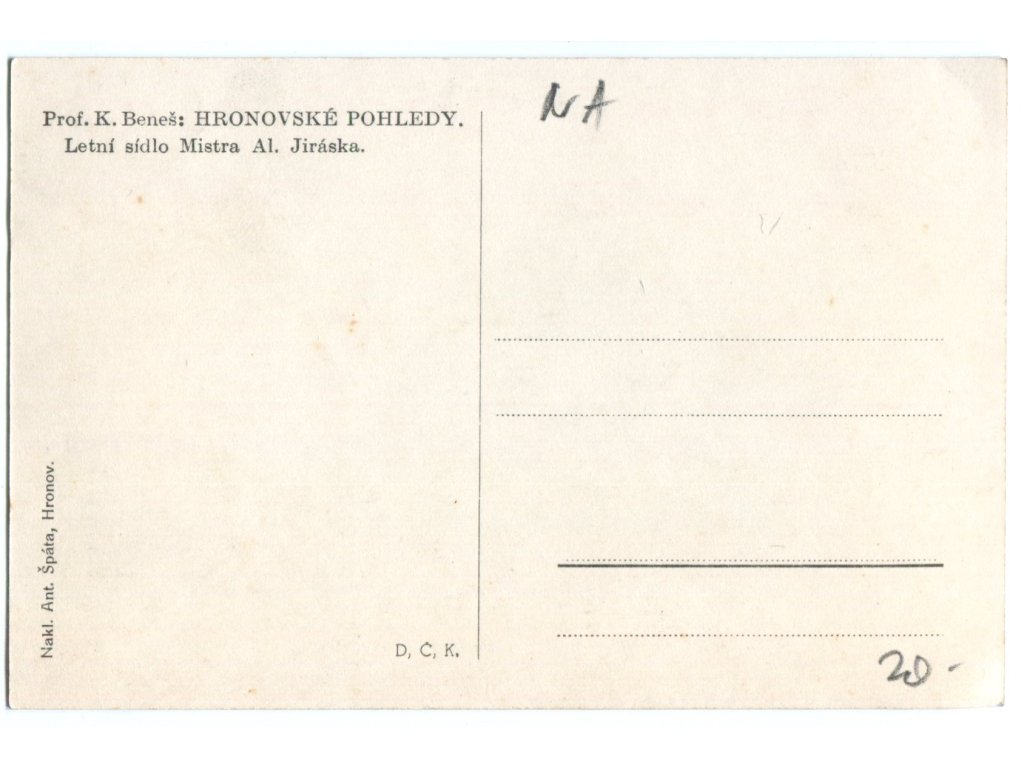 PROF. K. BENEŠ. Letní sídlo Mistra Al. Jiráska.