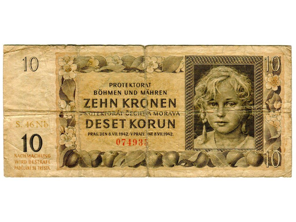 Protektorát Čechy a Morava. 10 korun 1942. Série Nb 46. Hej. 37b2.