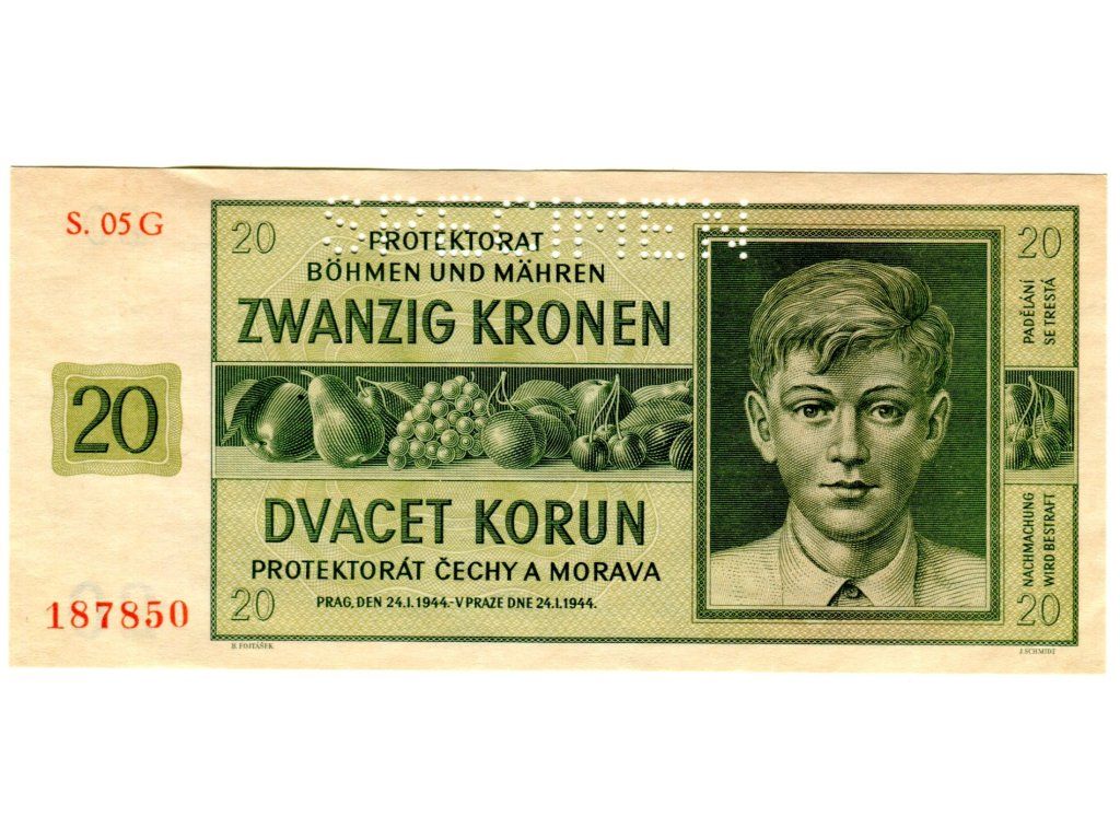Protektorát Čechy a Morava. 20 korun 1944. Série G 05. Hej. 40b.