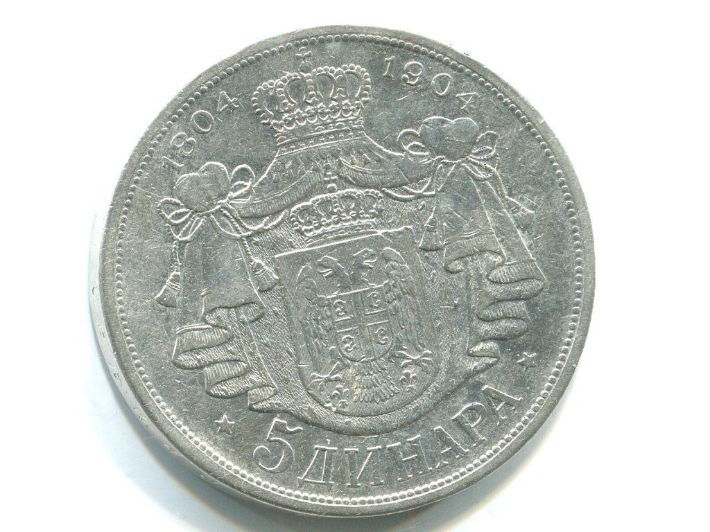 SRBSKO. Petar I. (1903-1918). 5 dinara 1904. Pamětní. Ag.