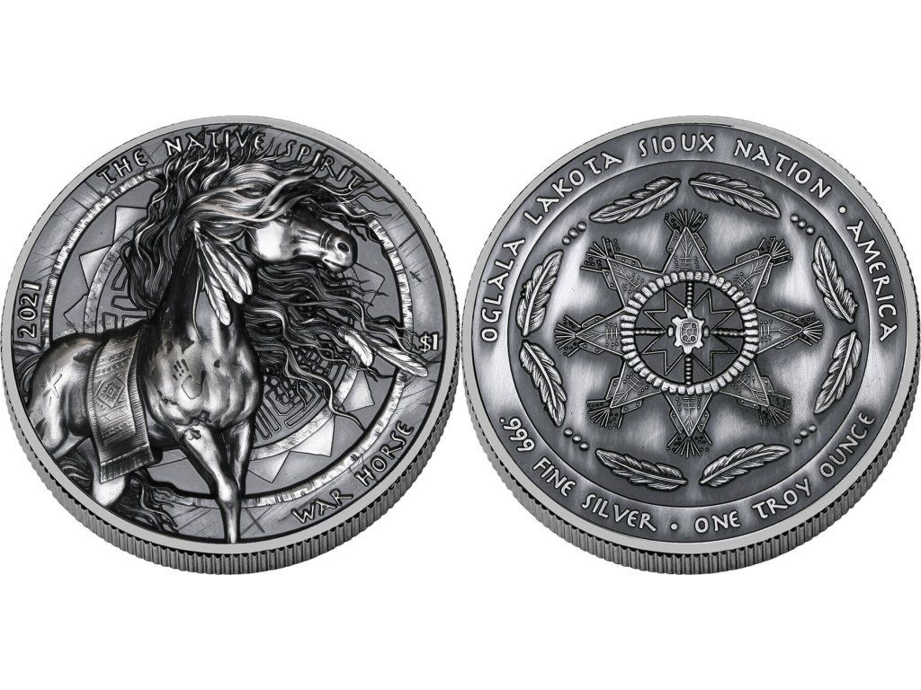 Získejte tento odvážný design z exkluzivní nové série Native Spirit, vyražený do 1 unce 99,9% ryzího stříbra národem Oglala Lakota Sioux. Lícní strana, vytvořená nejmodernější technikou ražby Ultra High Relief (ultra vysoký reliéf), zobrazuje válečného koně v dramatických, větrem rozevlátých detailech. Válečný kůň, který byl nedílnou součástí úspěchů původních obyvatel Ameriky v bitvách, je důležitým symbolem jejich identity.