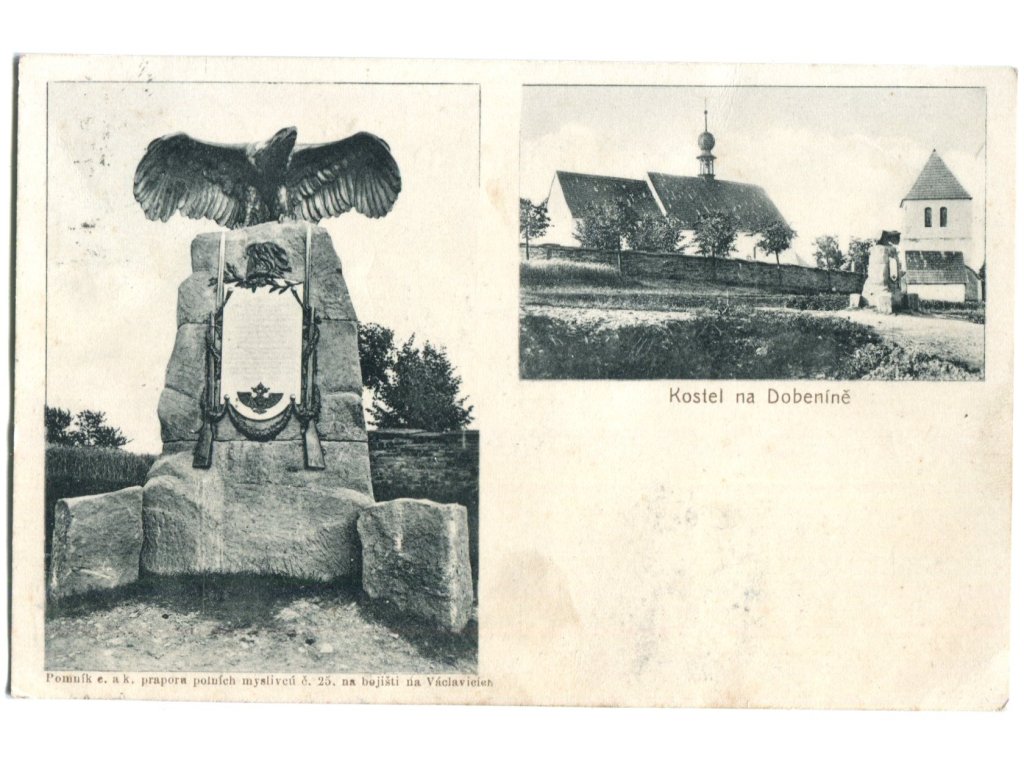 VÁCLAVICE. Pomník c. a k. praporu polních myslivců č. 25. Kostel na Dobeníně.