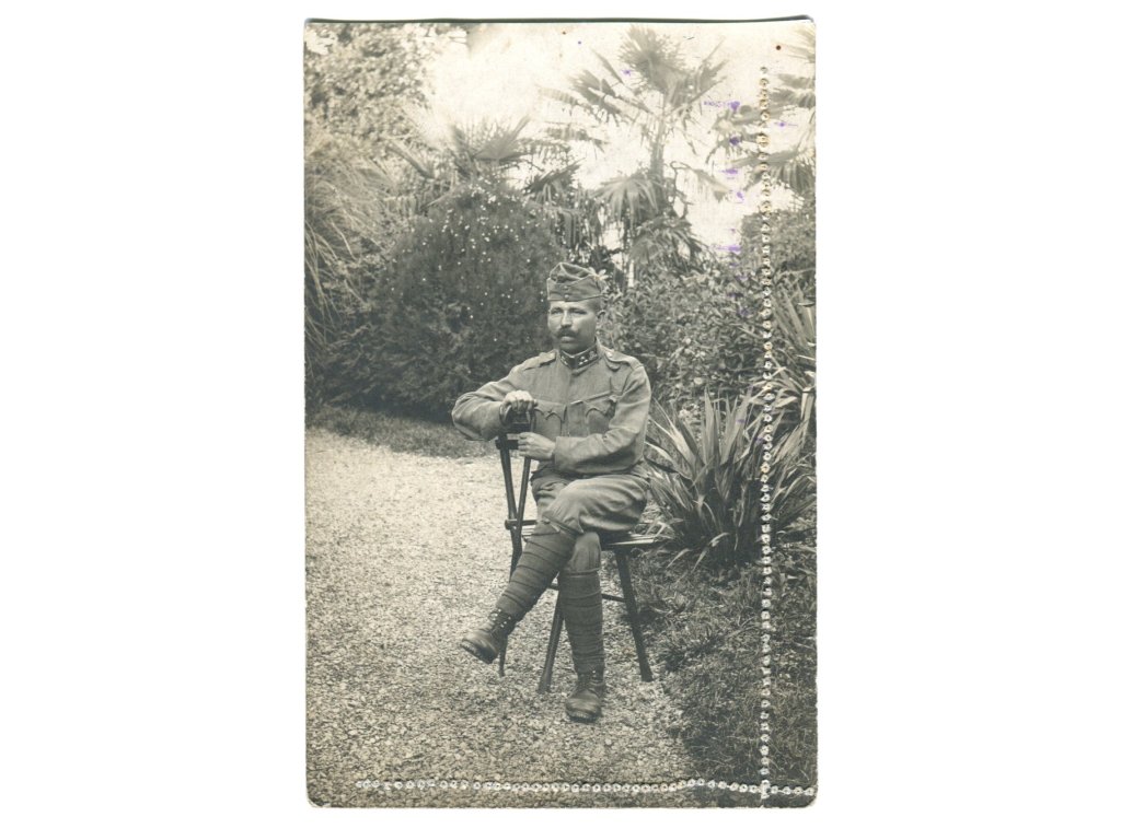 VOJÁK V UNIFORMĚ SEDÍCÍ NA ŽIDLI. 1916.