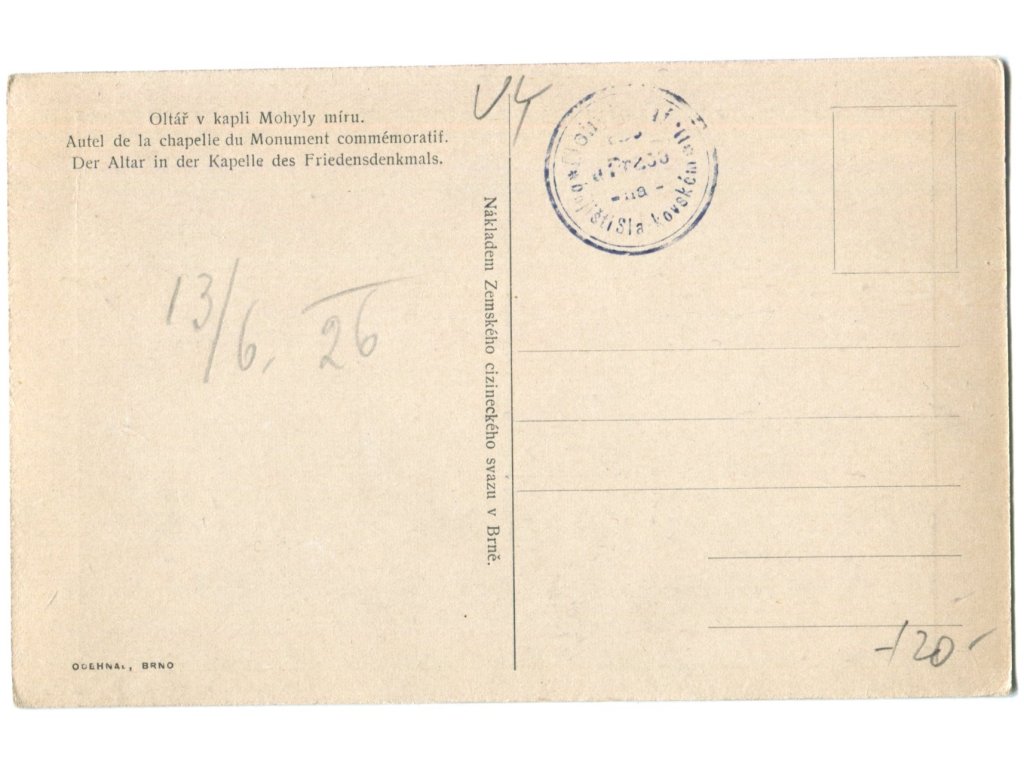 PAMÁTNÍK MOHYLA MÍRU. Oltář v kapli. 1926.