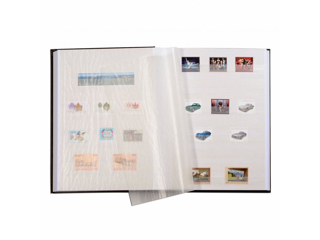 COMFORT A4 stockbook with 32 white pages, padded leatherette cover. The book features 9 clear glassine strips per page, double interleaves with double hinge binding.Doplňkové parametry